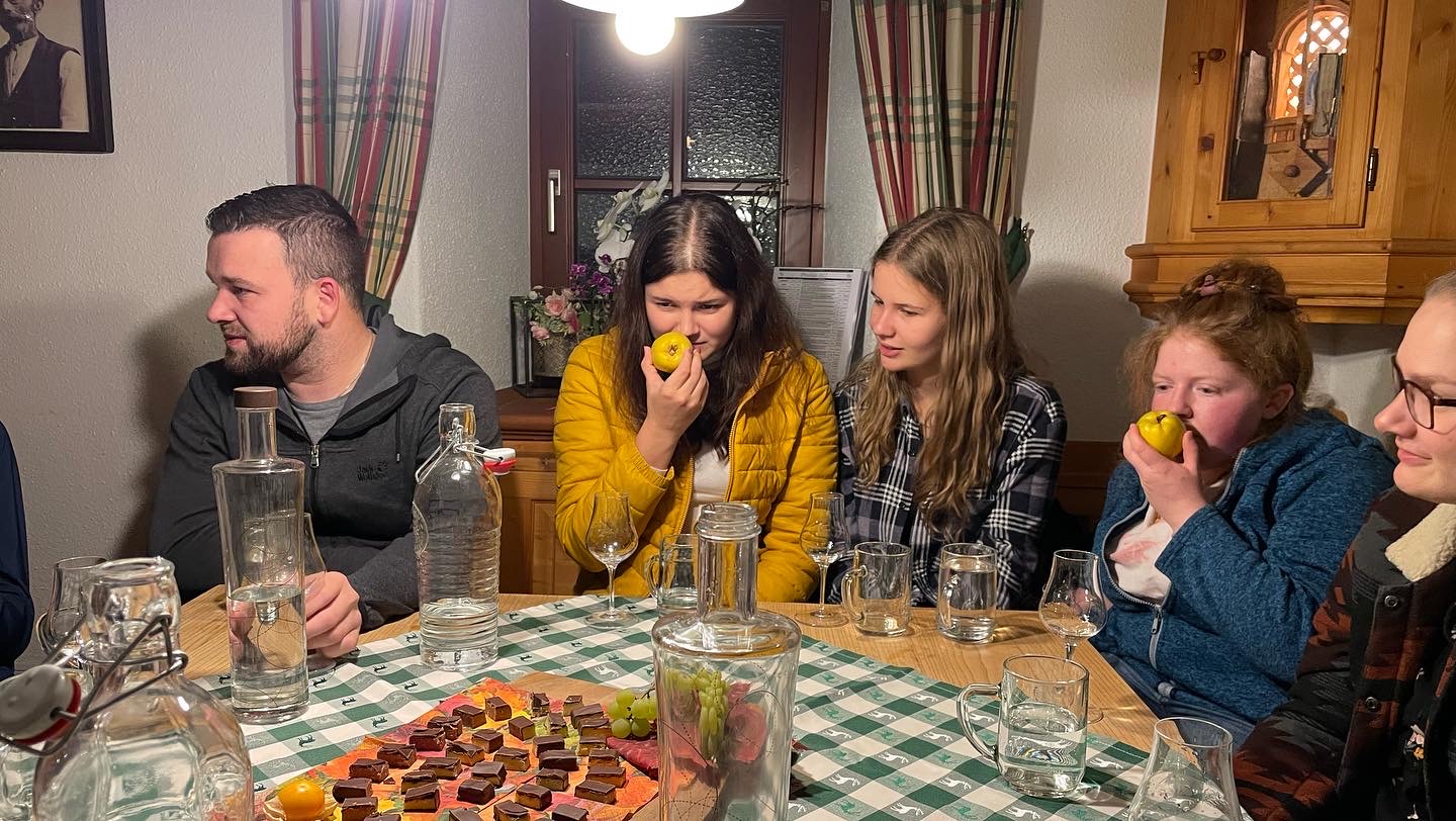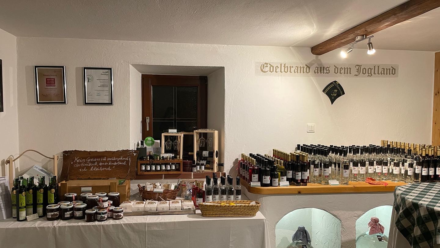 Ganz stolz präsentierten sie uns dann vielseitige Edelbrände, welche wir anschließend genussvoll mit zahlreichen Schokoladen, vom Birkfelder Schokoladenproduzenten Felber, verkosteten. Doch so eine kompetente Verkostung benötigte Zeit und somit wurden uns währenddessen diverse Methoden dazu geschildert. Zum gemütlichen Abschluss besichtigten wir den schönen Direktvermarktungsraum der Familie und tratschten noch ein bisschen über den Unterschied der Begriffe Edelbrand, Schnaps und Spirituosen.