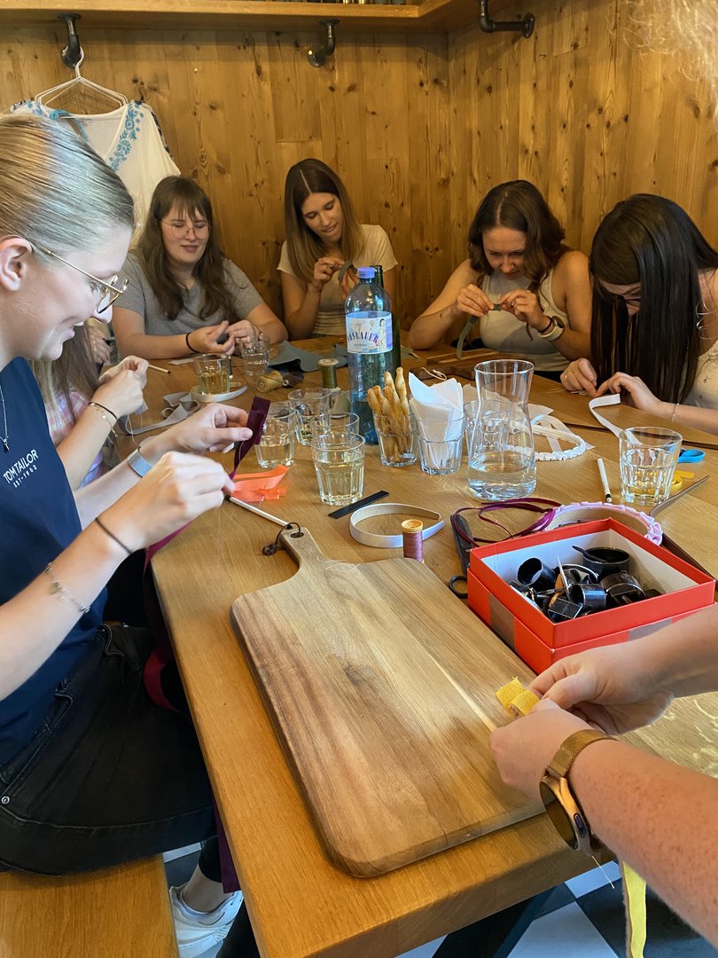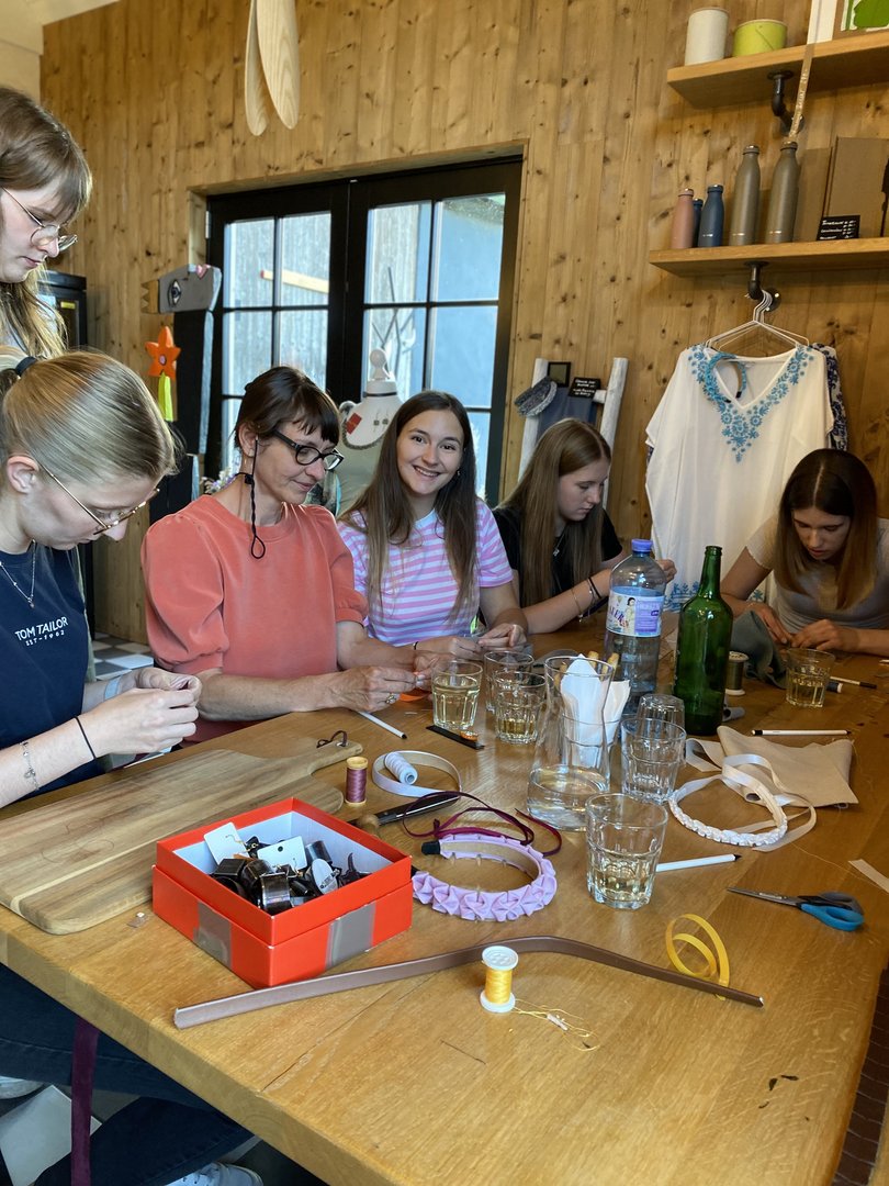 Im Anschluss konnte aus verschiedenen Recyclingmaterialien, wie alte Bänder, Leder und Stoffreste, Haarreifen, Haarbänder und Haarspangen hergestellt werden. Auch Materialine, an die man nicht im ersten Moment denkt, wie beispielsweise eine Warnweste, ein Fahrradschlauch oder ein alter Fallschirm standen zur Verfügung. Jeder konnte seiner Kreativität freien Lauf lassen.